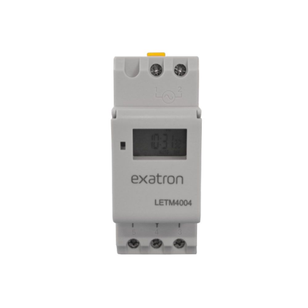 Timer Digital para Trilho DIN Bivolt Exatron Temporizador Timer Digital para Trilho DIN Bivolt Exatron Temporizador O Timer Digital para Trilho DIN Bivolt Exatron Temporizador é ideal para ligar e desligar aparelhos elétricos ou eletrônicos em horários programados pelo usuário, como: refletores, luminárias, anúncios luminosos, sinalizadores, TVs, rádios, dentre outros. Informações técnicas: Pré-configuração avançada de até uma semana antes; Bateria de NI-MH para salvar a programação em caso de queda de luz; Tensão: 110-240V~ 50/60Hz; Limite de Voltagem: ±10%; Precisão: ≤2seg /dia @25°C; Programações: 40 programações, 20 ON e 20 OFF; Display: LCD; Contato de comutação: 1 comutador; Capacidade da Bateria: >100 horas(NI-MH battery); Temperatura Ambiente: 0~+40°C; Dimensões: 87x65x36mm;