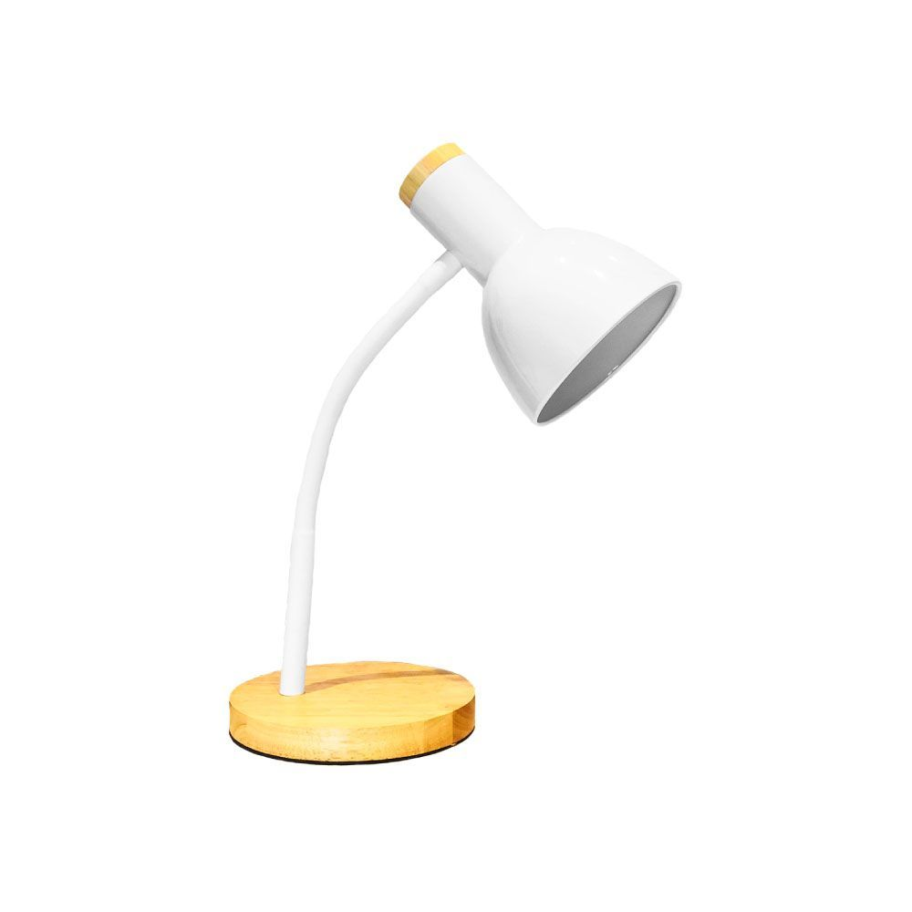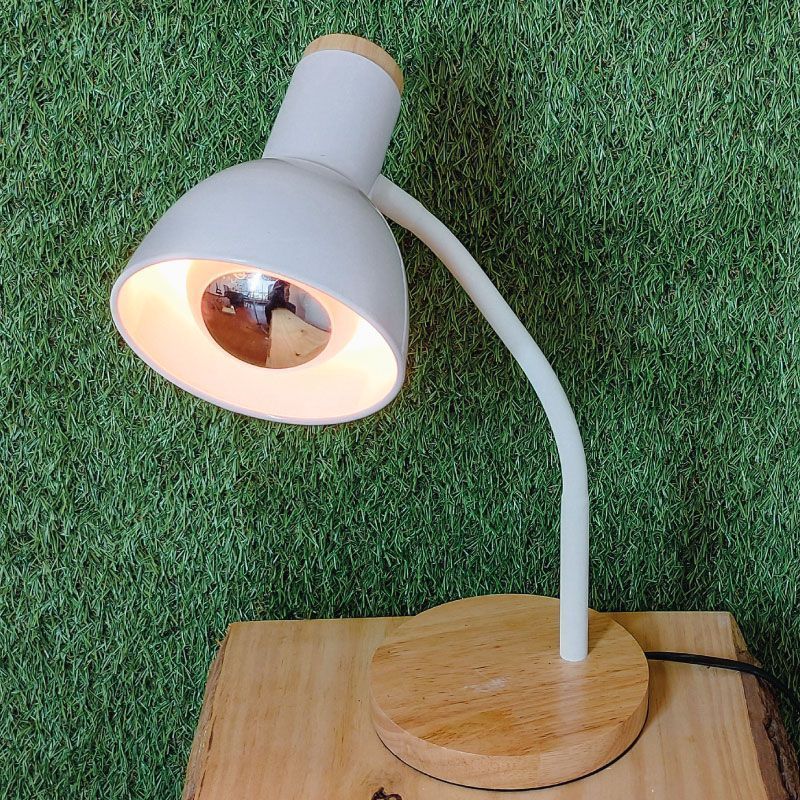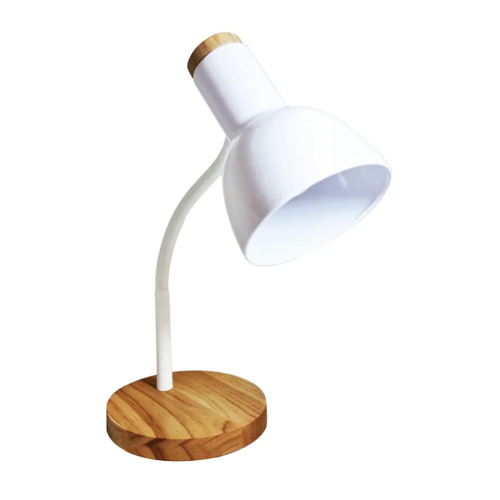 Acabamento com detalhes de madeira e possui haste articulável para direcionar a luz onde desejar.